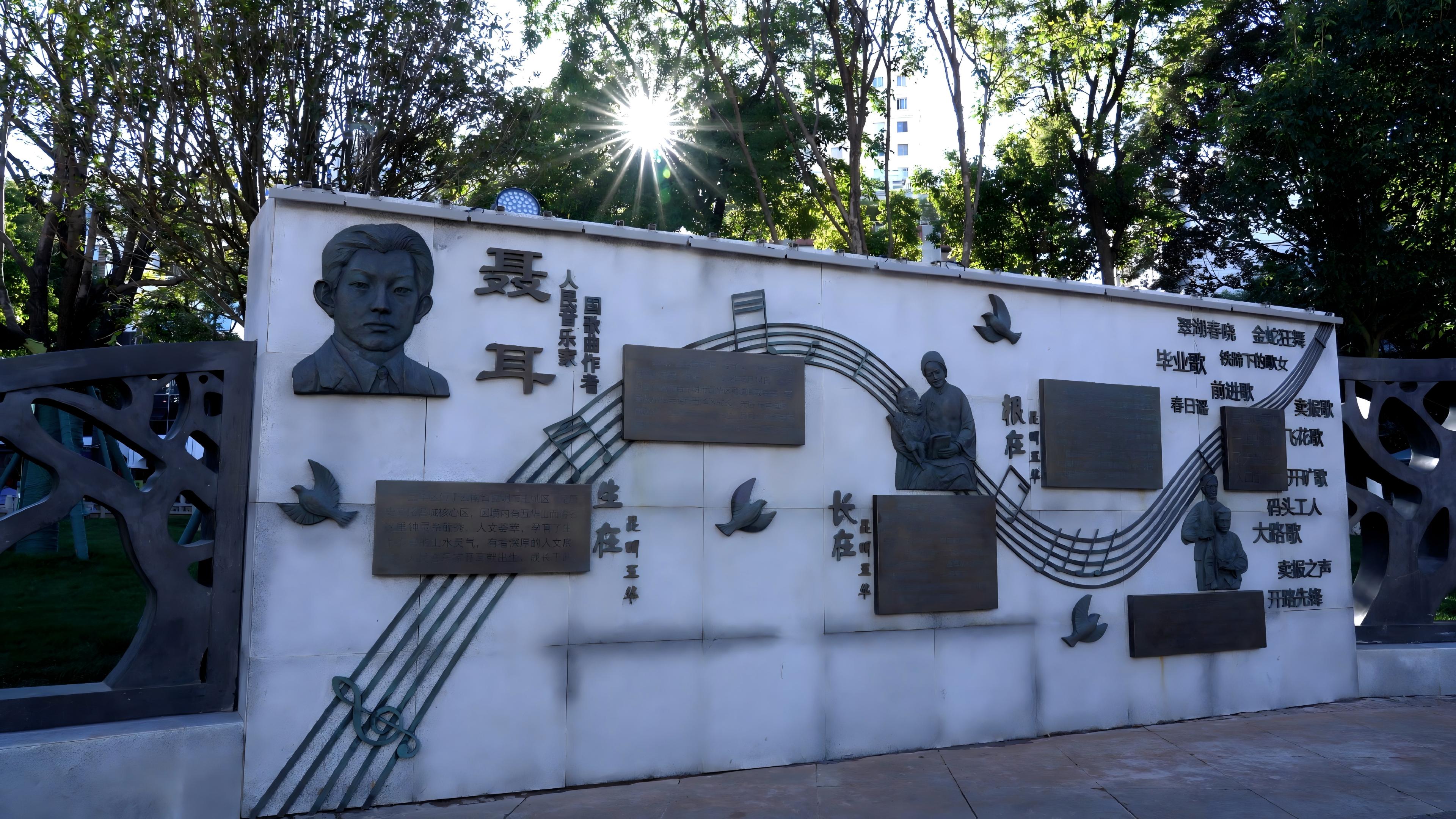 聂耳雕塑一侧,是一座以“聂耳与国歌”为主题的文化墙。文化墙左侧以五线谱为弦贯穿始终,象征聂耳一生与音乐结缘、用音乐谱写生命乐章、最终成为国之歌者的光辉历程,内容分为三部分:分别呈现聂耳生在昆明五华——长在昆明五华——根在昆明五华。这些鲜活而真实的事迹,以浮雕形式再次呈现,仿佛聂耳就在我们身边,也是展现出了这位人民音乐家与五华区深厚的情感联结。右侧为国歌的诞生背景,详细记录着《义勇军进行曲》是如何从一首电影主题曲变成一首鼓舞中华民族觉醒并奋起反抗日本侵略者的战歌,再成为每个中国人都必唱的国歌,并时刻激励着中华民族要“起来,不愿做奴隶的人们!”中间部分为朱德元帅为聂耳的题词——“人民的音乐家”和国歌的谱曲,写尽了聂耳从所生所长的昆明五华走向全国,并投身革命浪潮的人生轨迹,也凸显了从童音到国魂的革命奋斗史。下面以长城串联着今年“9•3”阅兵中习近平总书记提出的“正义必胜!和平必胜!人民必胜!”号召,周围以和平鸽象征着世界和平的愿望。整个墙面以灰色为主,既庄严又肃穆,也起到时刻警示后人铭记历史缅怀先烈的作用。